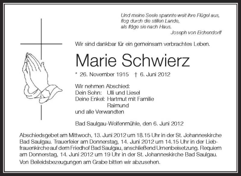 Hier finden Sie alle Traueranzeigen aus der Zeitung, die bisher für Marie Schwierz erschienen sind. Weitere Traueranzeigen, die in der Zeitung erscheinen, werden hier ebenfalls aufgelistet