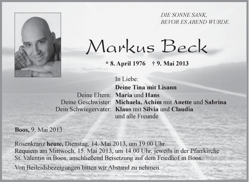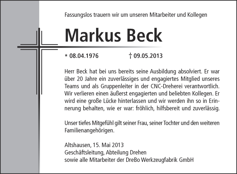 Hier finden Sie alle Traueranzeigen aus der Zeitung, die bisher für Markus Beck erschienen sind. Weitere Traueranzeigen, die in der Zeitung erscheinen, werden hier ebenfalls aufgelistet