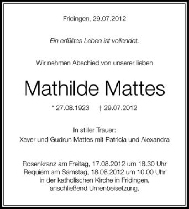 Hier finden Sie alle Traueranzeigen aus der Zeitung, die bisher für Mathilde Mattes erschienen sind. Weitere Traueranzeigen, die in der Zeitung erscheinen, werden hier ebenfalls aufgelistet