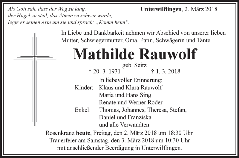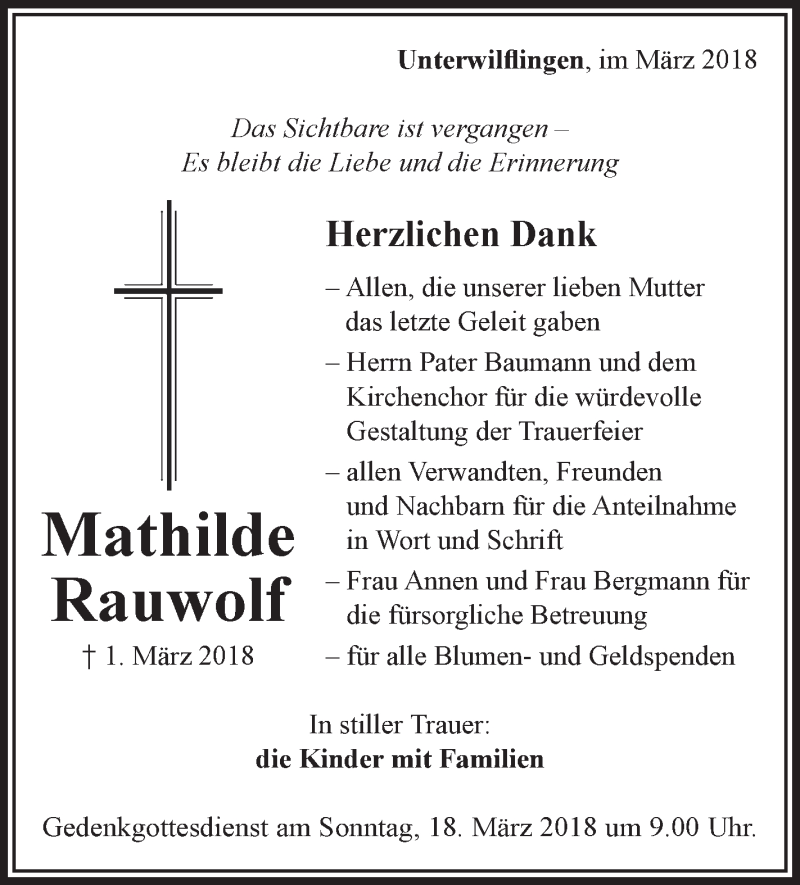 Hier finden Sie alle Traueranzeigen aus der Zeitung, die bisher für Mathilde Rauwolf erschienen sind. Weitere Traueranzeigen, die in der Zeitung erscheinen, werden hier ebenfalls aufgelistet
