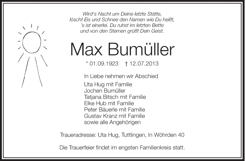 Hier finden Sie alle Traueranzeigen aus der Zeitung, die bisher für Max Bumüller erschienen sind. Weitere Traueranzeigen, die in der Zeitung erscheinen, werden hier ebenfalls aufgelistet