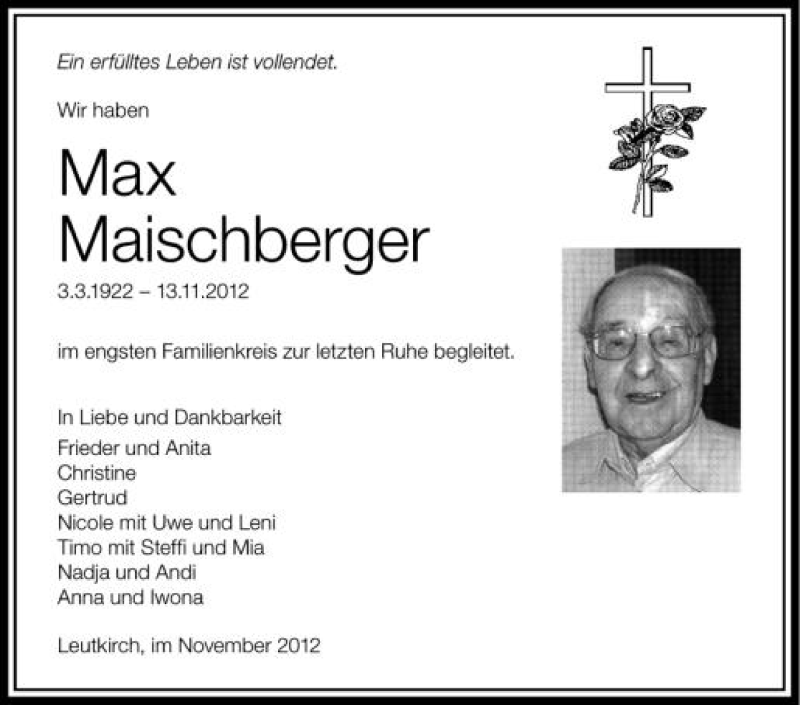 Hier finden Sie alle Traueranzeigen aus der Zeitung, die bisher für Max Maischberger erschienen sind. Weitere Traueranzeigen, die in der Zeitung erscheinen, werden hier ebenfalls aufgelistet