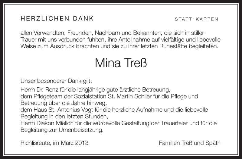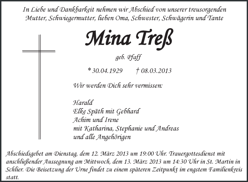Hier finden Sie alle Traueranzeigen aus der Zeitung, die bisher für Mina Treß erschienen sind. Weitere Traueranzeigen, die in der Zeitung erscheinen, werden hier ebenfalls aufgelistet