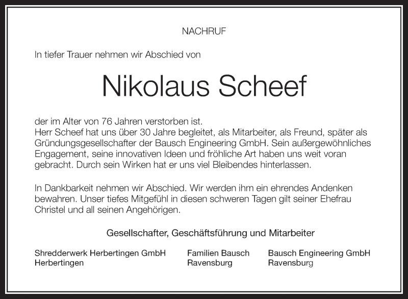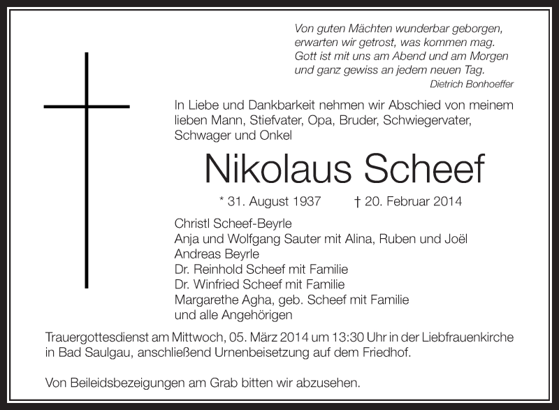 Hier finden Sie alle Traueranzeigen aus der Zeitung, die bisher für Nikolaus Scheef erschienen sind. Weitere Traueranzeigen, die in der Zeitung erscheinen, werden hier ebenfalls aufgelistet