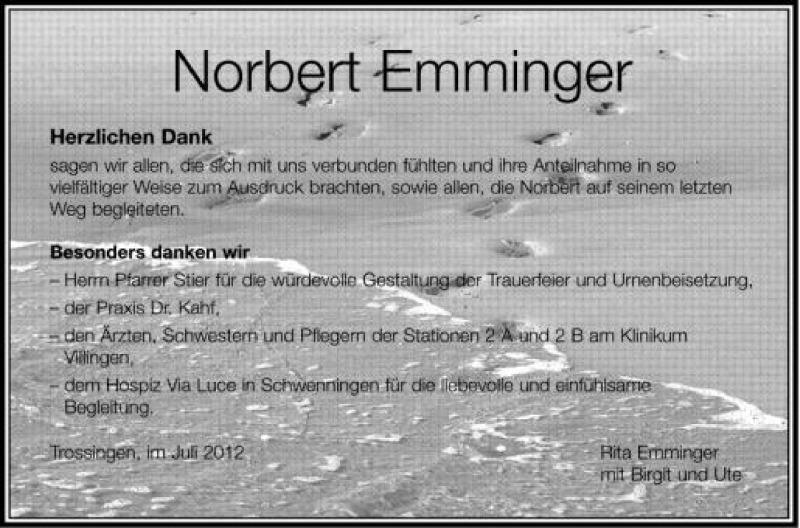 Hier finden Sie alle Traueranzeigen aus der Zeitung, die bisher für Norbert Emminger erschienen sind. Weitere Traueranzeigen, die in der Zeitung erscheinen, werden hier ebenfalls aufgelistet