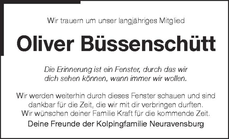 Hier finden Sie alle Traueranzeigen aus der Zeitung, die bisher für Oliver Büssenschütt erschienen sind. Weitere Traueranzeigen, die in der Zeitung erscheinen, werden hier ebenfalls aufgelistet