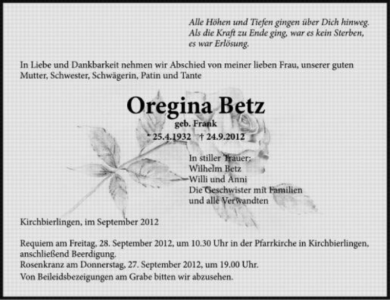 Hier finden Sie alle Traueranzeigen aus der Zeitung, die bisher für Oregina Betz erschienen sind. Weitere Traueranzeigen, die in der Zeitung erscheinen, werden hier ebenfalls aufgelistet