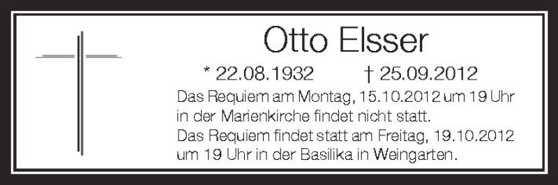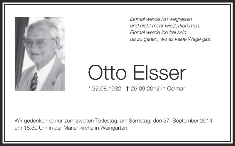 Hier finden Sie alle Traueranzeigen aus der Zeitung, die bisher für Otto Elsser erschienen sind. Weitere Traueranzeigen, die in der Zeitung erscheinen, werden hier ebenfalls aufgelistet