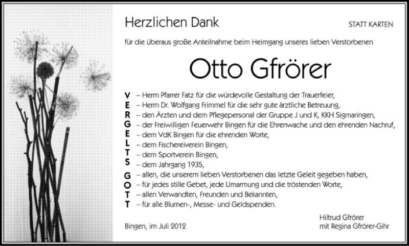Hier finden Sie alle Traueranzeigen aus der Zeitung, die bisher für Otto Gfrörer erschienen sind. Weitere Traueranzeigen, die in der Zeitung erscheinen, werden hier ebenfalls aufgelistet