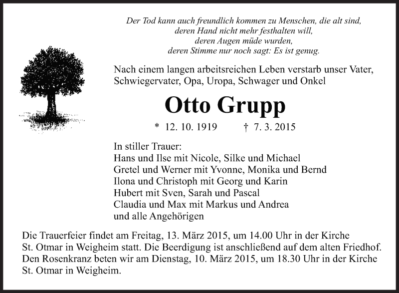 Hier finden Sie alle Traueranzeigen aus der Zeitung, die bisher für Otto Grupp erschienen sind. Weitere Traueranzeigen, die in der Zeitung erscheinen, werden hier ebenfalls aufgelistet