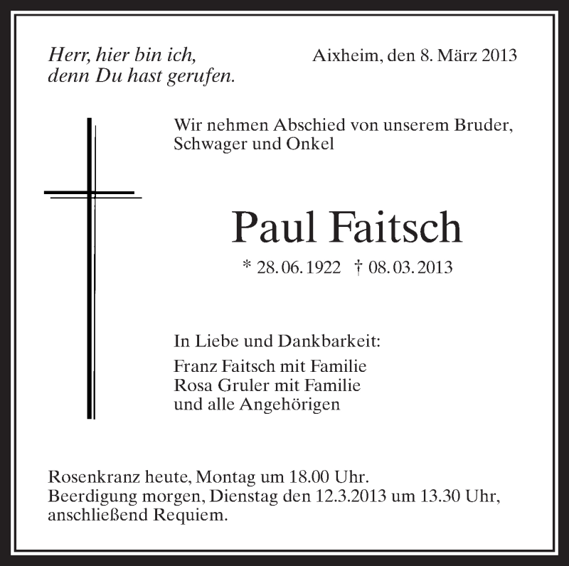 Hier finden Sie alle Traueranzeigen aus der Zeitung, die bisher für Paul Faitsch erschienen sind. Weitere Traueranzeigen, die in der Zeitung erscheinen, werden hier ebenfalls aufgelistet