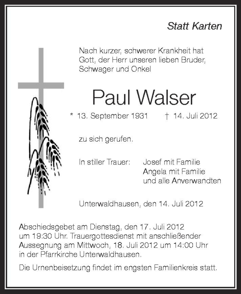 Hier finden Sie alle Traueranzeigen aus der Zeitung, die bisher für Paul Walser erschienen sind. Weitere Traueranzeigen, die in der Zeitung erscheinen, werden hier ebenfalls aufgelistet