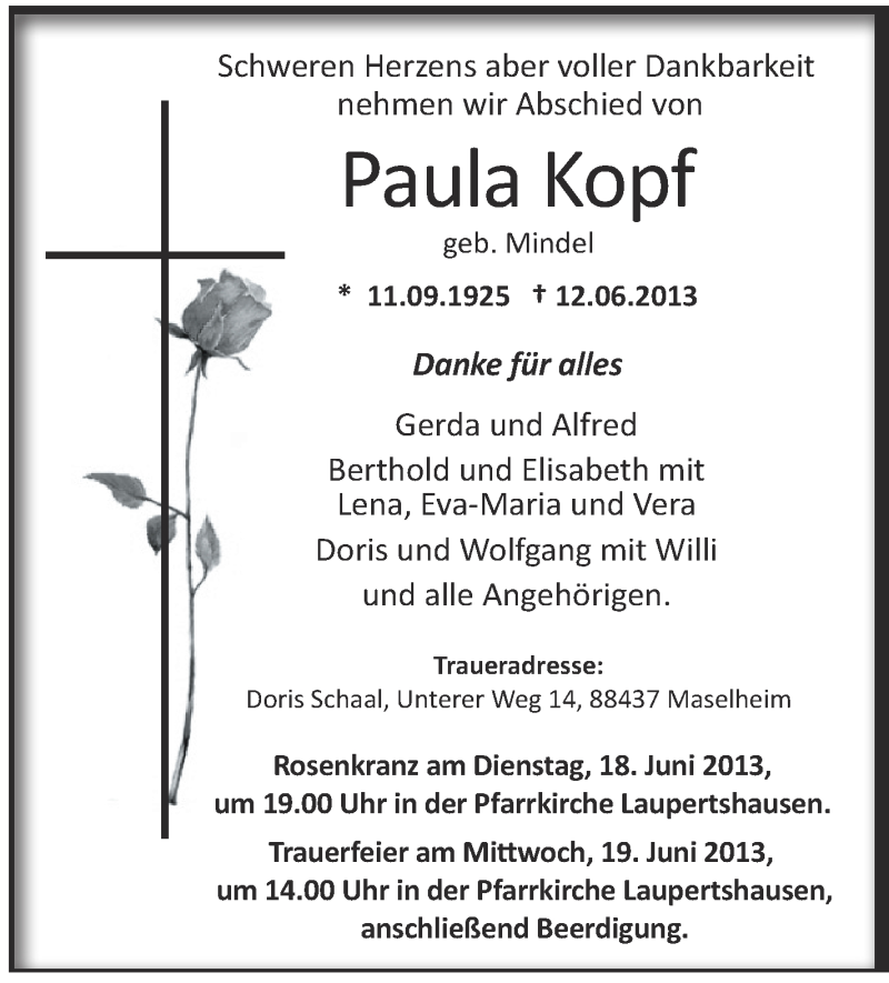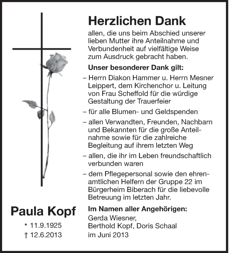 Hier finden Sie alle Traueranzeigen aus der Zeitung, die bisher für Paula Kopf erschienen sind. Weitere Traueranzeigen, die in der Zeitung erscheinen, werden hier ebenfalls aufgelistet