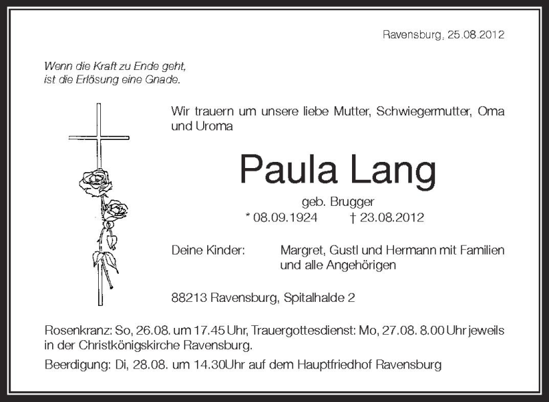 Hier finden Sie alle Traueranzeigen aus der Zeitung, die bisher für Paula Lang erschienen sind. Weitere Traueranzeigen, die in der Zeitung erscheinen, werden hier ebenfalls aufgelistet