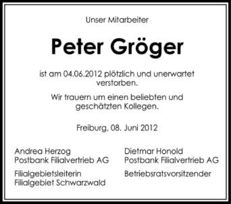 Hier finden Sie alle Traueranzeigen aus der Zeitung, die bisher für Peter Gröger erschienen sind. Weitere Traueranzeigen, die in der Zeitung erscheinen, werden hier ebenfalls aufgelistet
