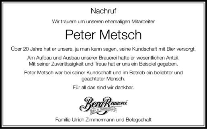 Hier finden Sie alle Traueranzeigen aus der Zeitung, die bisher für Peter Metsch erschienen sind. Weitere Traueranzeigen, die in der Zeitung erscheinen, werden hier ebenfalls aufgelistet