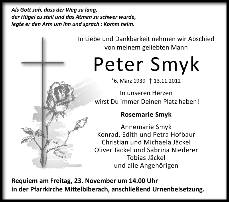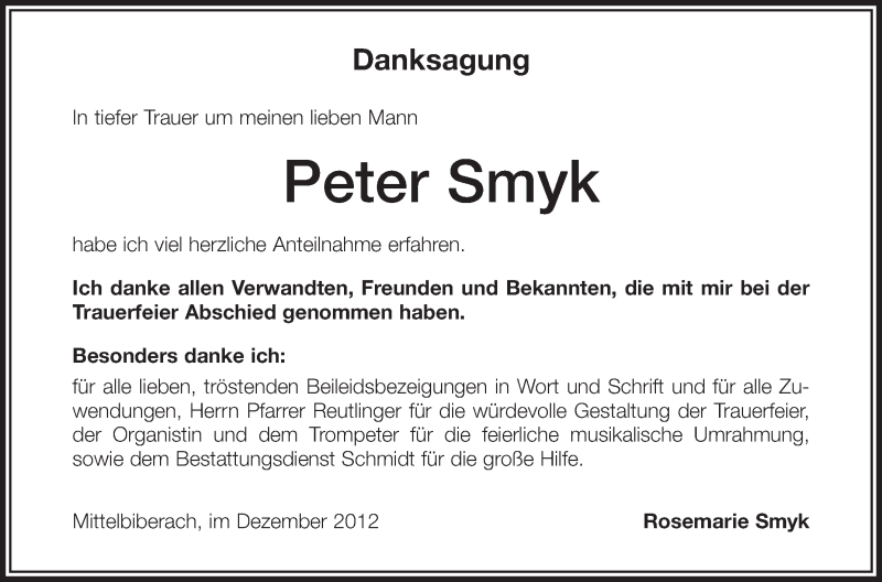 Hier finden Sie alle Traueranzeigen aus der Zeitung, die bisher für Peter Smyk erschienen sind. Weitere Traueranzeigen, die in der Zeitung erscheinen, werden hier ebenfalls aufgelistet