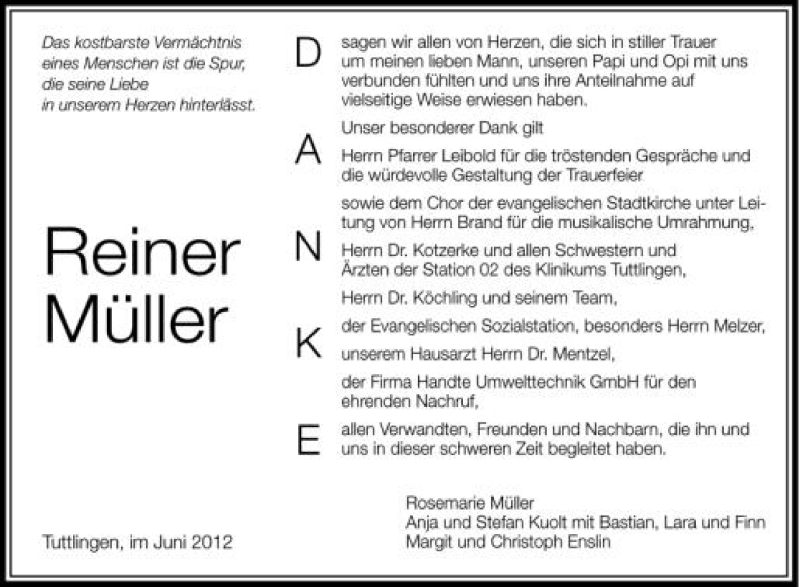 Hier finden Sie alle Traueranzeigen aus der Zeitung, die bisher für Reiner Müller erschienen sind. Weitere Traueranzeigen, die in der Zeitung erscheinen, werden hier ebenfalls aufgelistet
