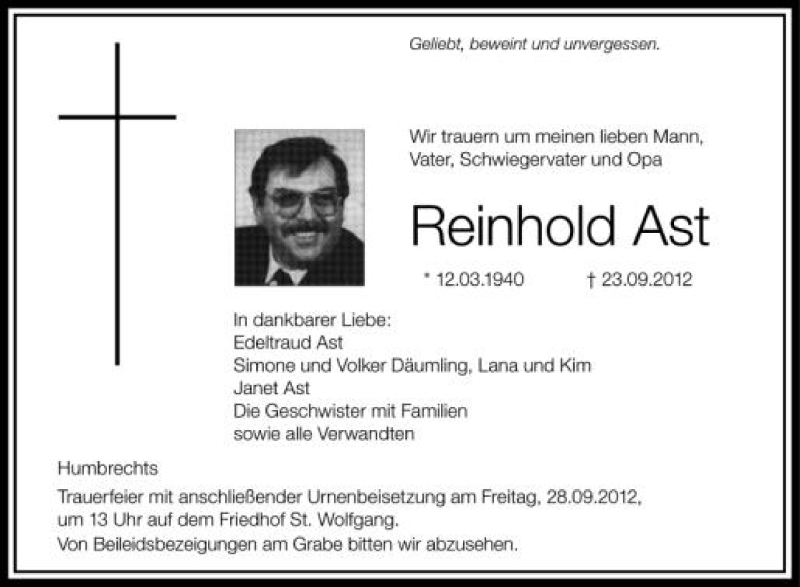 Hier finden Sie alle Traueranzeigen aus der Zeitung, die bisher für Reinhold Ast erschienen sind. Weitere Traueranzeigen, die in der Zeitung erscheinen, werden hier ebenfalls aufgelistet