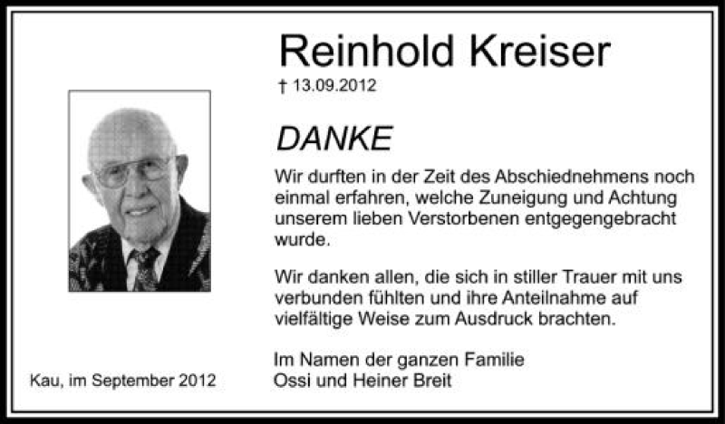 Hier finden Sie alle Traueranzeigen aus der Zeitung, die bisher für Reinhold Kreiser erschienen sind. Weitere Traueranzeigen, die in der Zeitung erscheinen, werden hier ebenfalls aufgelistet