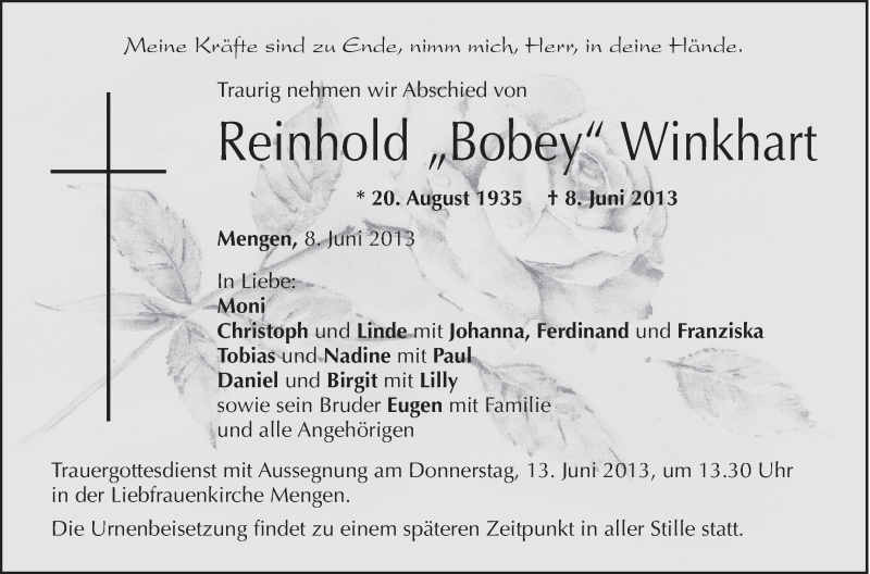 Hier finden Sie alle Traueranzeigen aus der Zeitung, die bisher für Reinhold Winkhart erschienen sind. Weitere Traueranzeigen, die in der Zeitung erscheinen, werden hier ebenfalls aufgelistet