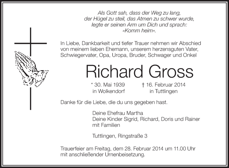 Hier finden Sie alle Traueranzeigen aus der Zeitung, die bisher für Richard Gross erschienen sind. Weitere Traueranzeigen, die in der Zeitung erscheinen, werden hier ebenfalls aufgelistet