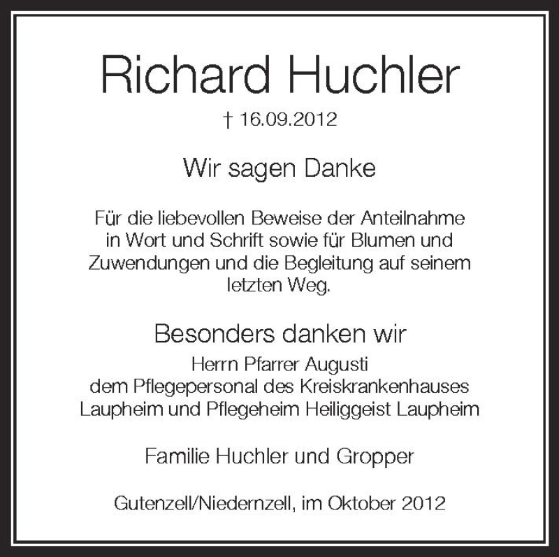 Hier finden Sie alle Traueranzeigen aus der Zeitung, die bisher für Richard Huchler erschienen sind. Weitere Traueranzeigen, die in der Zeitung erscheinen, werden hier ebenfalls aufgelistet