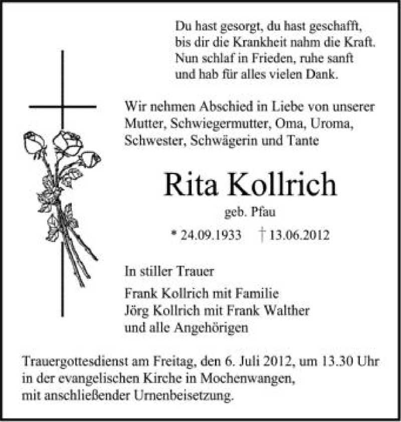 Hier finden Sie alle Traueranzeigen aus der Zeitung, die bisher für Rita Kollrich erschienen sind. Weitere Traueranzeigen, die in der Zeitung erscheinen, werden hier ebenfalls aufgelistet