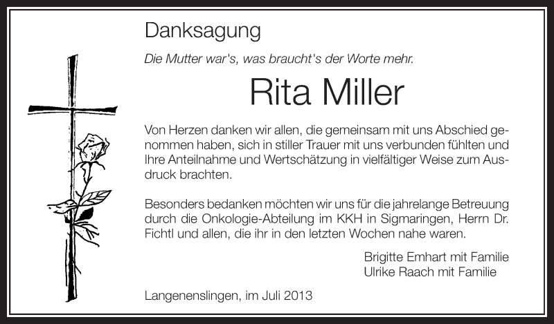Hier finden Sie alle Traueranzeigen aus der Zeitung, die bisher für Rita Miller erschienen sind. Weitere Traueranzeigen, die in der Zeitung erscheinen, werden hier ebenfalls aufgelistet