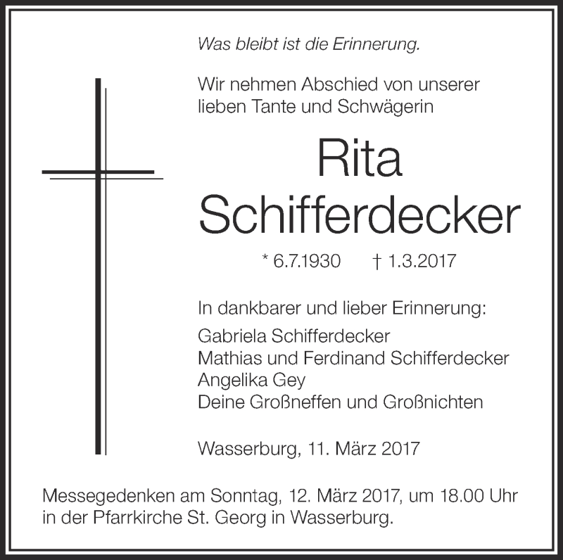 Hier finden Sie alle Traueranzeigen aus der Zeitung, die bisher für Rita Schifferdecker erschienen sind. Weitere Traueranzeigen, die in der Zeitung erscheinen, werden hier ebenfalls aufgelistet