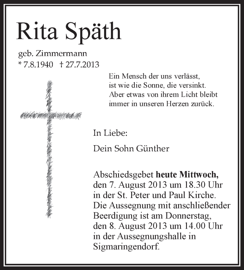 Hier finden Sie alle Traueranzeigen aus der Zeitung, die bisher für Rita Späth erschienen sind. Weitere Traueranzeigen, die in der Zeitung erscheinen, werden hier ebenfalls aufgelistet