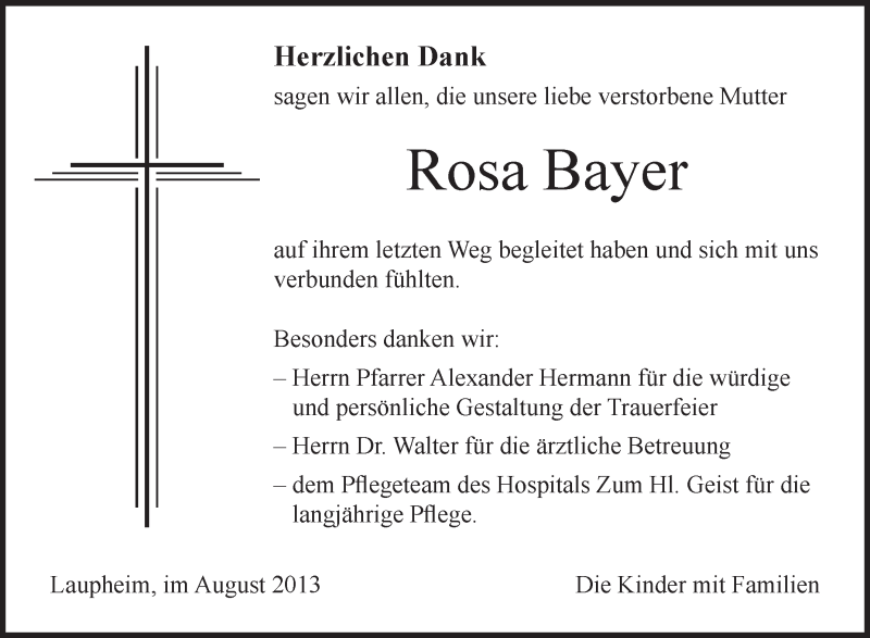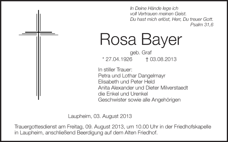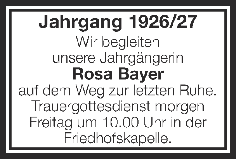 Hier finden Sie alle Traueranzeigen aus der Zeitung, die bisher für Rosa Bayer erschienen sind. Weitere Traueranzeigen, die in der Zeitung erscheinen, werden hier ebenfalls aufgelistet