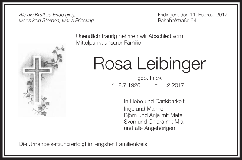 Hier finden Sie alle Traueranzeigen aus der Zeitung, die bisher für Rosa Leibfinger erschienen sind. Weitere Traueranzeigen, die in der Zeitung erscheinen, werden hier ebenfalls aufgelistet