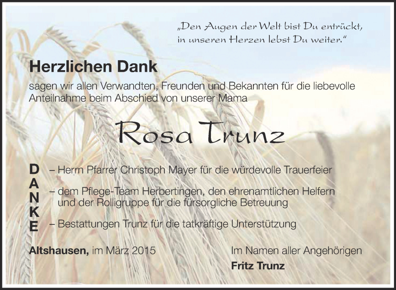 Hier finden Sie alle Traueranzeigen aus der Zeitung, die bisher für Rosa Trunz erschienen sind. Weitere Traueranzeigen, die in der Zeitung erscheinen, werden hier ebenfalls aufgelistet