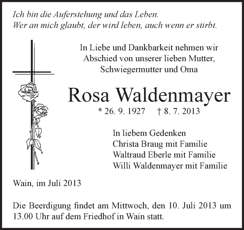 Hier finden Sie alle Traueranzeigen aus der Zeitung, die bisher für Rosa Waldenmayer erschienen sind. Weitere Traueranzeigen, die in der Zeitung erscheinen, werden hier ebenfalls aufgelistet