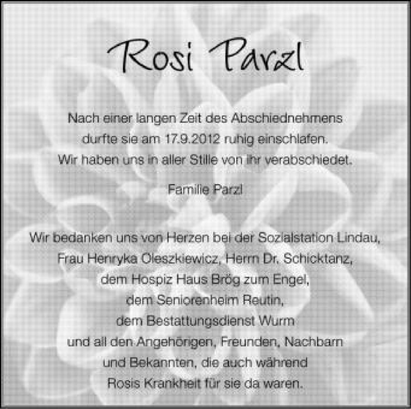 Hier finden Sie alle Traueranzeigen aus der Zeitung, die bisher für Rosi Parzl erschienen sind. Weitere Traueranzeigen, die in der Zeitung erscheinen, werden hier ebenfalls aufgelistet