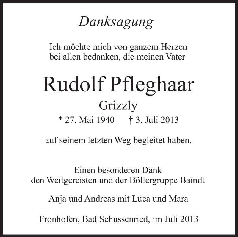 Hier finden Sie alle Traueranzeigen aus der Zeitung, die bisher für Rudolf Pfleghaar erschienen sind. Weitere Traueranzeigen, die in der Zeitung erscheinen, werden hier ebenfalls aufgelistet