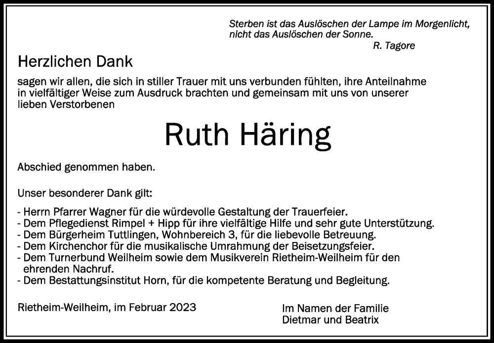 Hier finden Sie alle Traueranzeigen aus der Zeitung, die bisher für Ruth Häring erschienen sind. Weitere Traueranzeigen, die in der Zeitung erscheinen, werden hier ebenfalls aufgelistet
