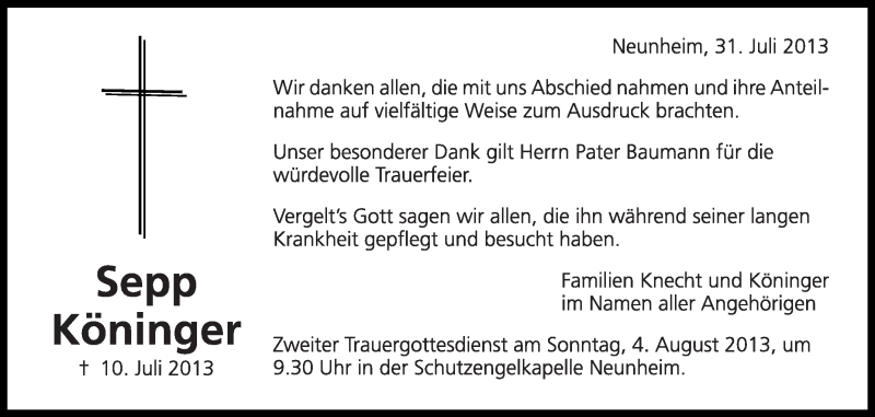 Hier finden Sie alle Traueranzeigen aus der Zeitung, die bisher für Sepp Köninger erschienen sind. Weitere Traueranzeigen, die in der Zeitung erscheinen, werden hier ebenfalls aufgelistet