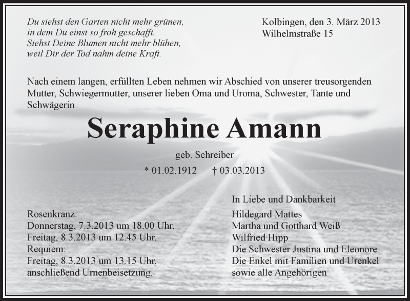 Hier finden Sie alle Traueranzeigen aus der Zeitung, die bisher für Seraphine Amann erschienen sind. Weitere Traueranzeigen, die in der Zeitung erscheinen, werden hier ebenfalls aufgelistet