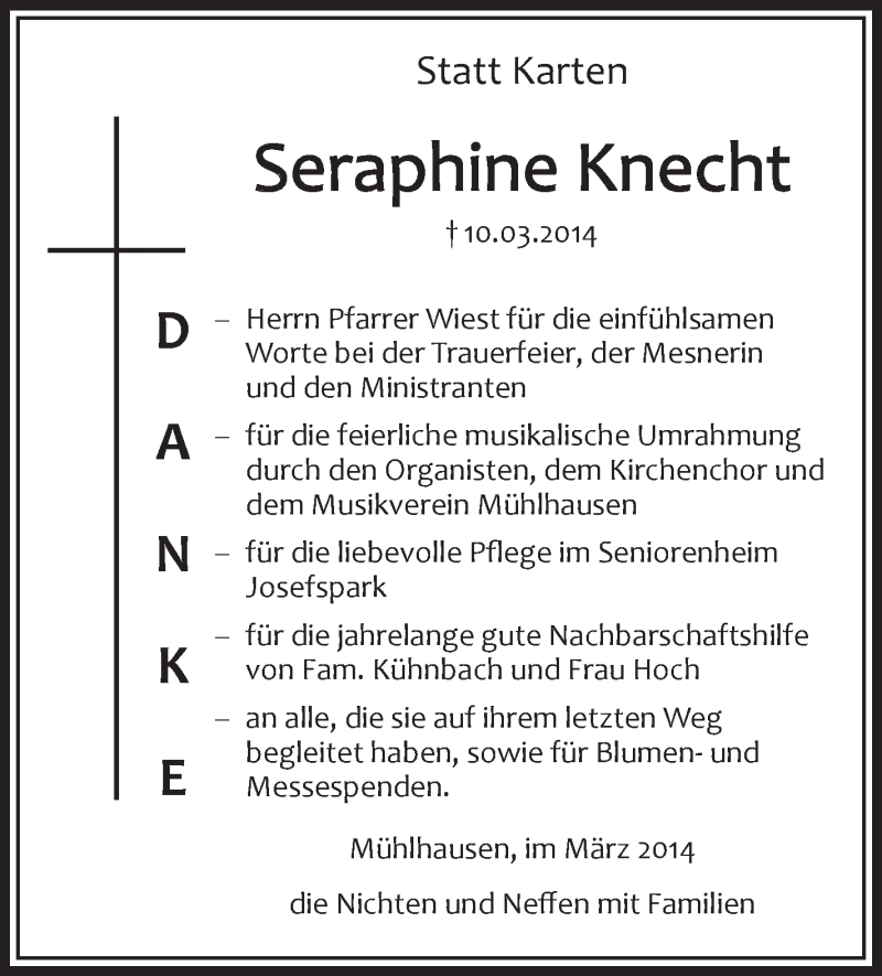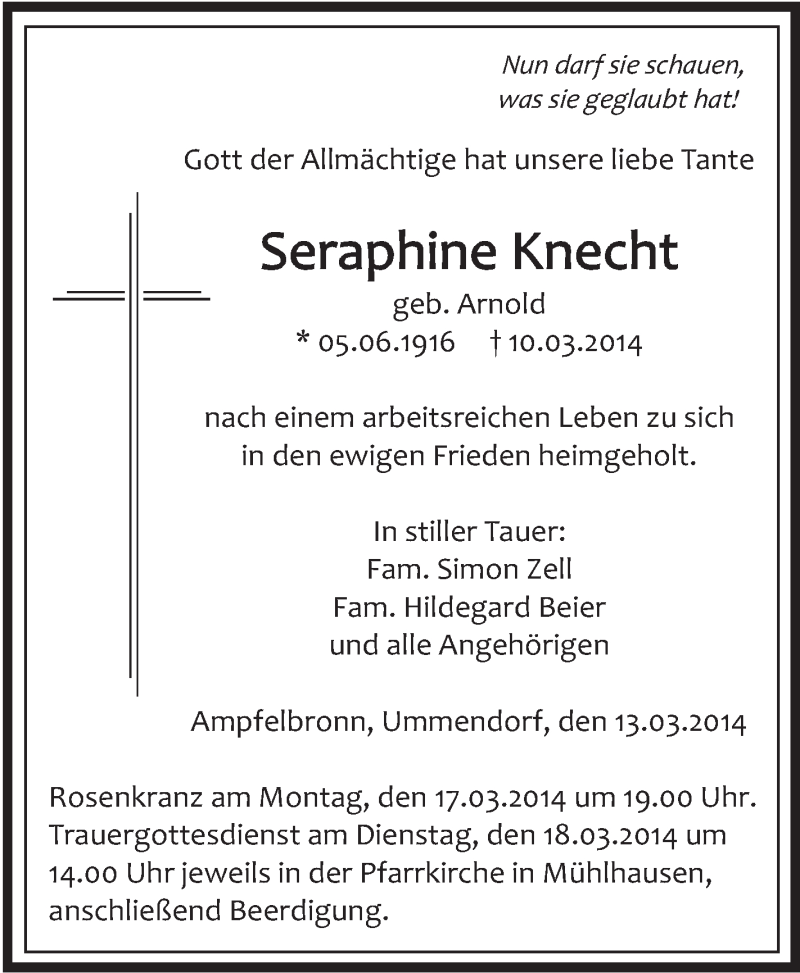 Hier finden Sie alle Traueranzeigen aus der Zeitung, die bisher für Seraphine Knecht erschienen sind. Weitere Traueranzeigen, die in der Zeitung erscheinen, werden hier ebenfalls aufgelistet