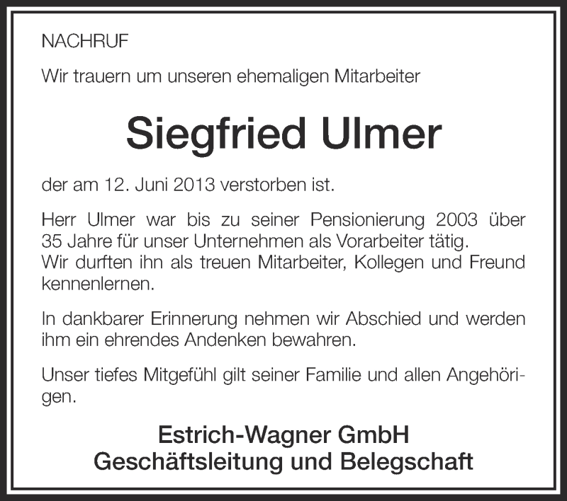 Hier finden Sie alle Traueranzeigen aus der Zeitung, die bisher für Siegfried Ulmer erschienen sind. Weitere Traueranzeigen, die in der Zeitung erscheinen, werden hier ebenfalls aufgelistet