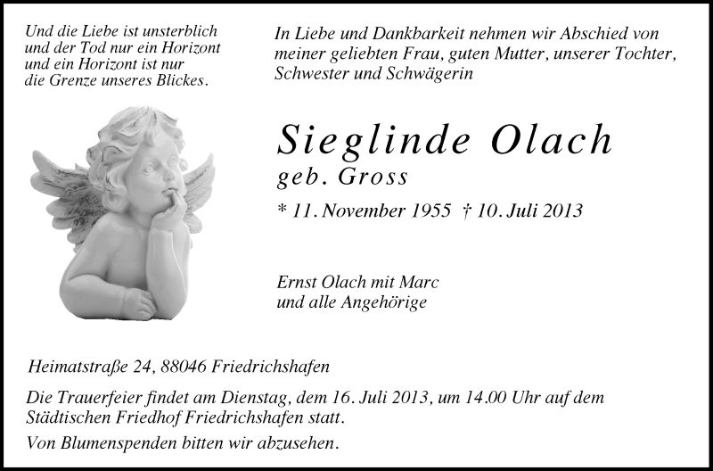 Hier finden Sie alle Traueranzeigen aus der Zeitung, die bisher für Sieglinde Olach erschienen sind. Weitere Traueranzeigen, die in der Zeitung erscheinen, werden hier ebenfalls aufgelistet