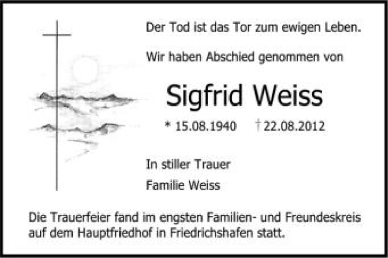 Hier finden Sie alle Traueranzeigen aus der Zeitung, die bisher für Sigfrid Weiss erschienen sind. Weitere Traueranzeigen, die in der Zeitung erscheinen, werden hier ebenfalls aufgelistet