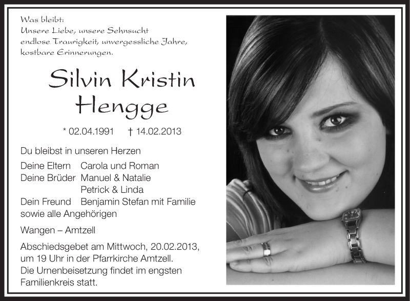 Hier finden Sie alle Traueranzeigen aus der Zeitung, die bisher für Silvin Kristin Hengge erschienen sind. Weitere Traueranzeigen, die in der Zeitung erscheinen, werden hier ebenfalls aufgelistet