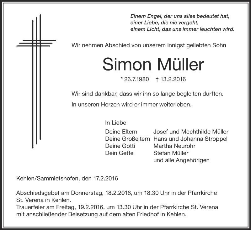Hier finden Sie alle Traueranzeigen aus der Zeitung, die bisher für Simon Müller erschienen sind. Weitere Traueranzeigen, die in der Zeitung erscheinen, werden hier ebenfalls aufgelistet