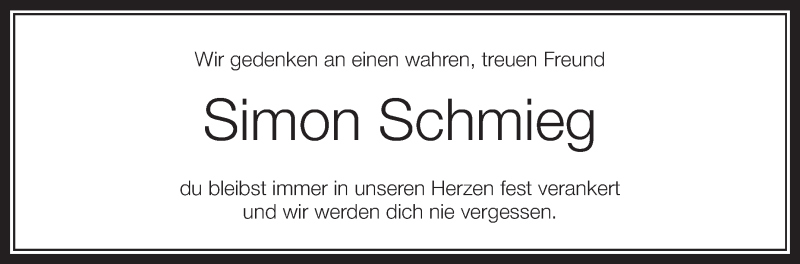 Hier finden Sie alle Traueranzeigen aus der Zeitung, die bisher für Simon Schmieg erschienen sind. Weitere Traueranzeigen, die in der Zeitung erscheinen, werden hier ebenfalls aufgelistet