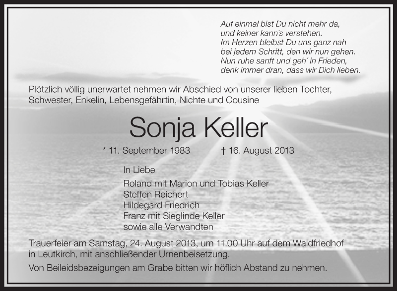 Hier finden Sie alle Traueranzeigen aus der Zeitung, die bisher für Sonja Keller erschienen sind. Weitere Traueranzeigen, die in der Zeitung erscheinen, werden hier ebenfalls aufgelistet