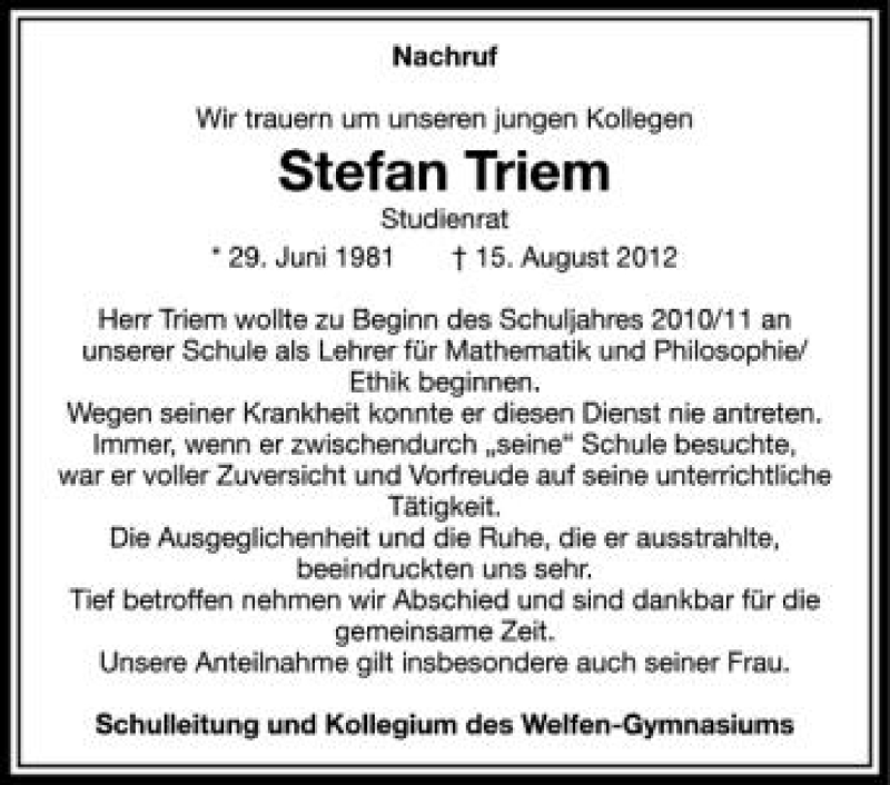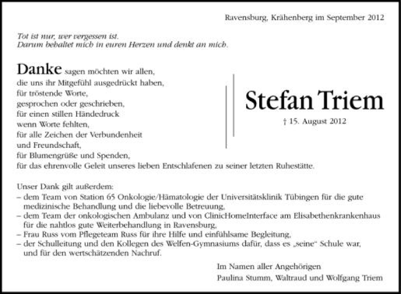 Hier finden Sie alle Traueranzeigen aus der Zeitung, die bisher für Stefan Triem erschienen sind. Weitere Traueranzeigen, die in der Zeitung erscheinen, werden hier ebenfalls aufgelistet