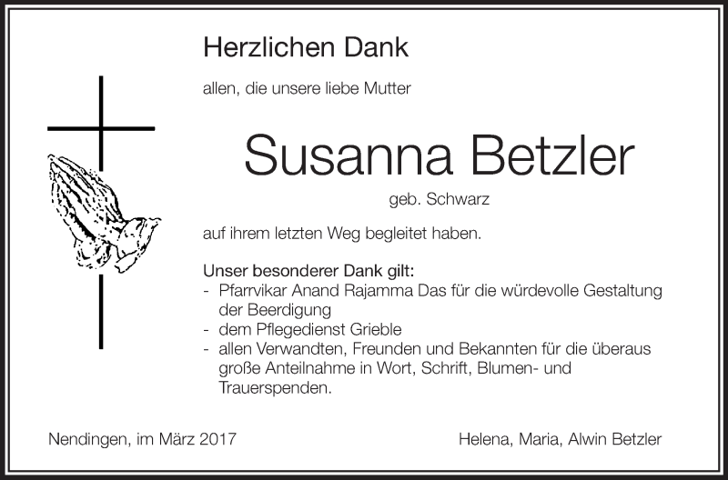 Hier finden Sie alle Traueranzeigen aus der Zeitung, die bisher für Susanna Betzler erschienen sind. Weitere Traueranzeigen, die in der Zeitung erscheinen, werden hier ebenfalls aufgelistet